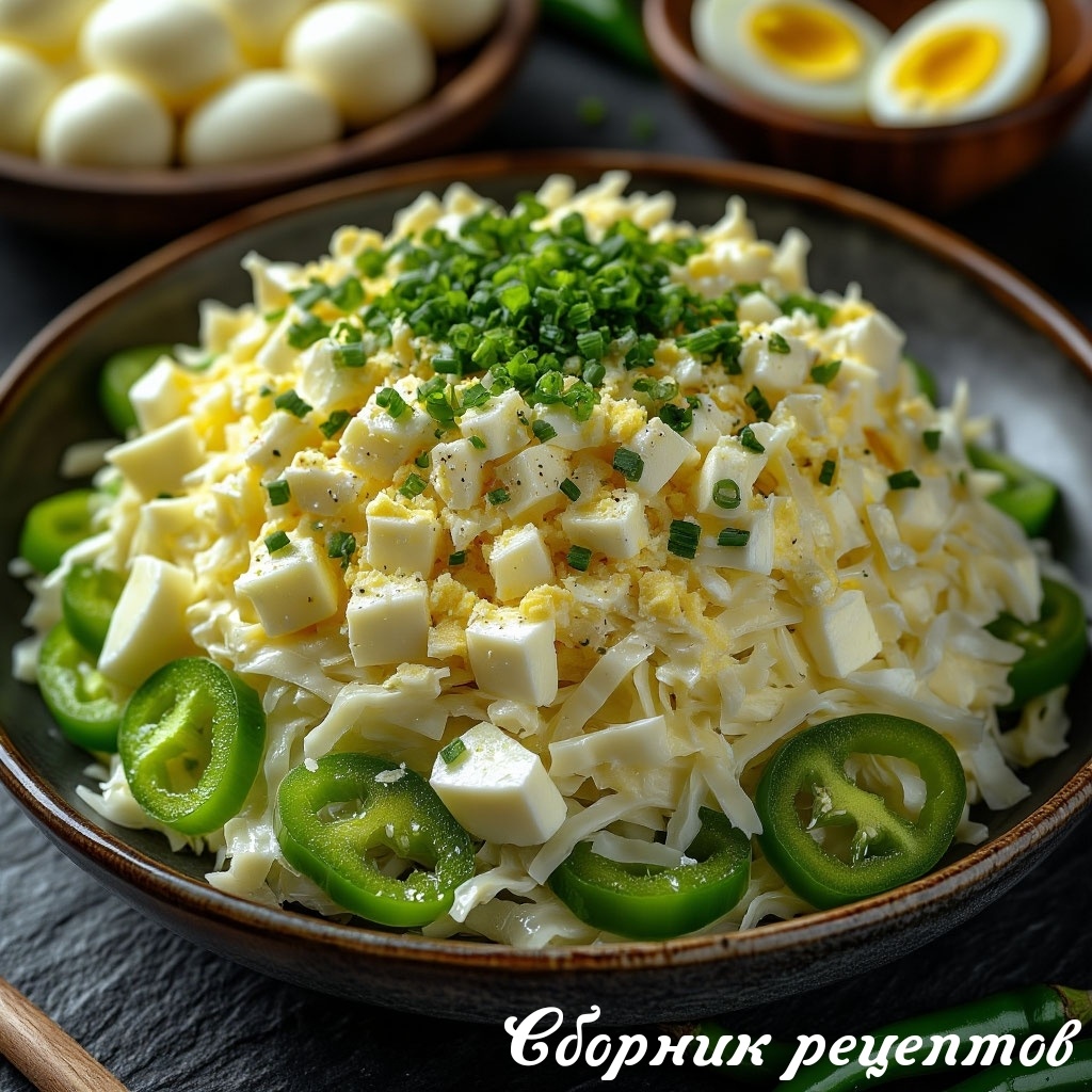 Настоящую лёгкость даёт сочетание свежего зелёного перца, мягких кубиков варёного яйца и тонко нашинкованной белокочанной капусты. Морковь добавляет лёгкую сладость, если она оказалась в холодильнике.