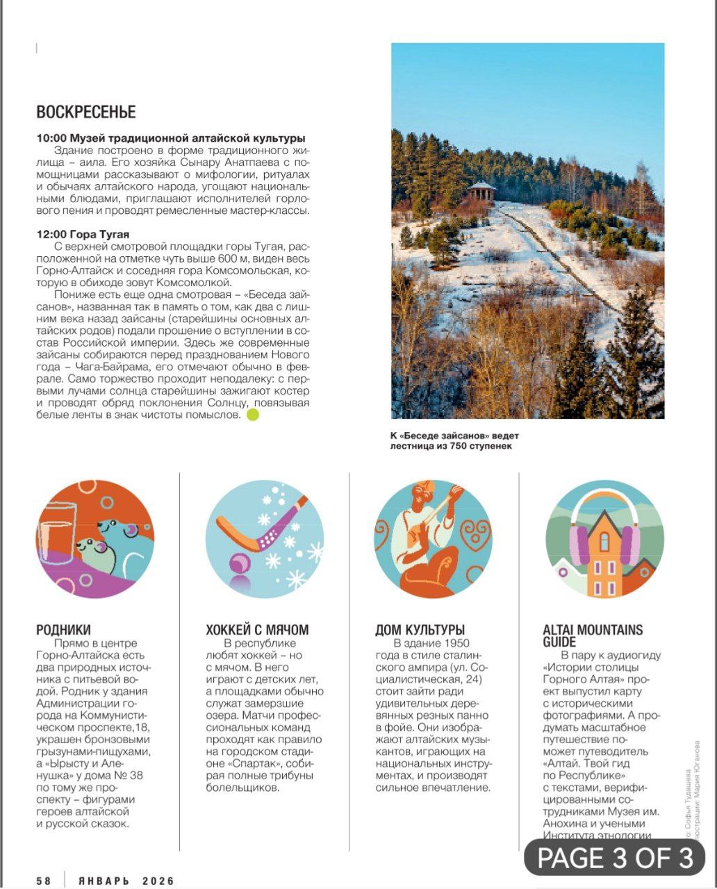 Далее читателям предлагают совершить трехдневную экскурсию с обязательным просмотром и посещением арт-объектов, родников, Центрального сквера, Национального музея им. А.В. Анохина, музея традиционной алтайской культуры Сынару Анатпаевой, ресторанов, кафе, сувенирных лавок и, конечно же, горы Туугая.