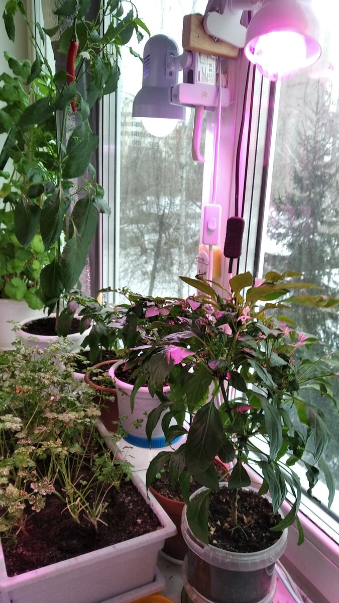 - маленький северо?западный подоконник, на котором установлен самодельный гроутент 90?80?40 см с LED?лампами, небольшим вентилятором, термометром и гигрометром;