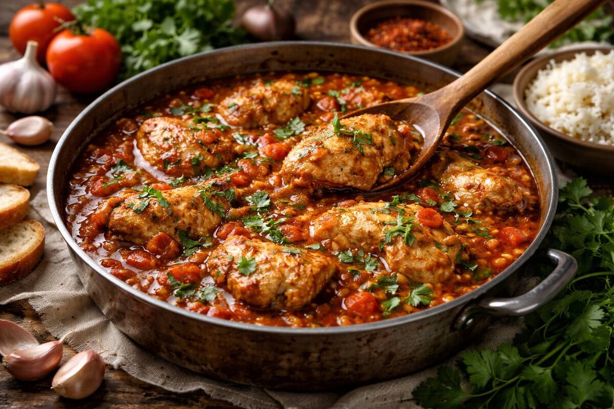 Чтобы чахохбили не превратилось в просто «курицу в соусе», важны три вещи: карамелизация лука, правильное обращение с томатами и расставленные во времени специи.