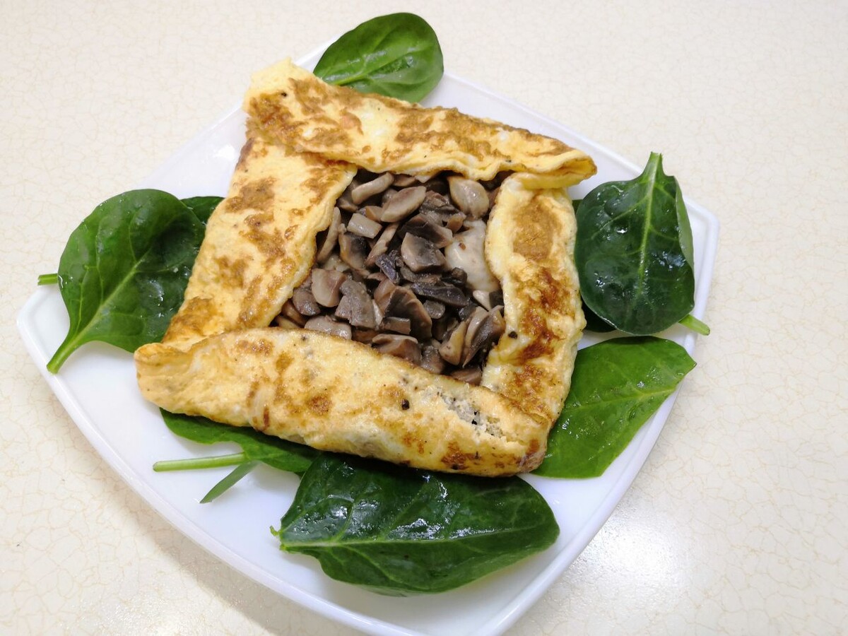 Начинка: Шампиньоны необходимо тщательно промыть и нарезать. На сковороде с небольшим количеством растительного масла обжарить грибы, добавив щепотку соли и перца. Как только они станут мягкими, ввести натертый сыр (можно использовать моцареллу, хотя твердый сыр подойдет лучше). Как только сыр расплавится, снять начинку с плиты.Омлет: Яйца смешиваются с молоком, солятся и перчатся. Получившуюся массу вылить на предварительно разогретую сковороду с маслом и готовить на маленьком огне, чтобы не подгорело. Аккуратно перевернуть яичную лепешку, чтобы она равномерно подрумянилась.Финальный штрих: В центр омлета аккуратно выложить грибную начинку с сыром, затем краями омлета подсолнить начинку, оставив центр открытым. Немного подержать на огне, после чего осторожно выложить на тарелку с листьями шпината.
