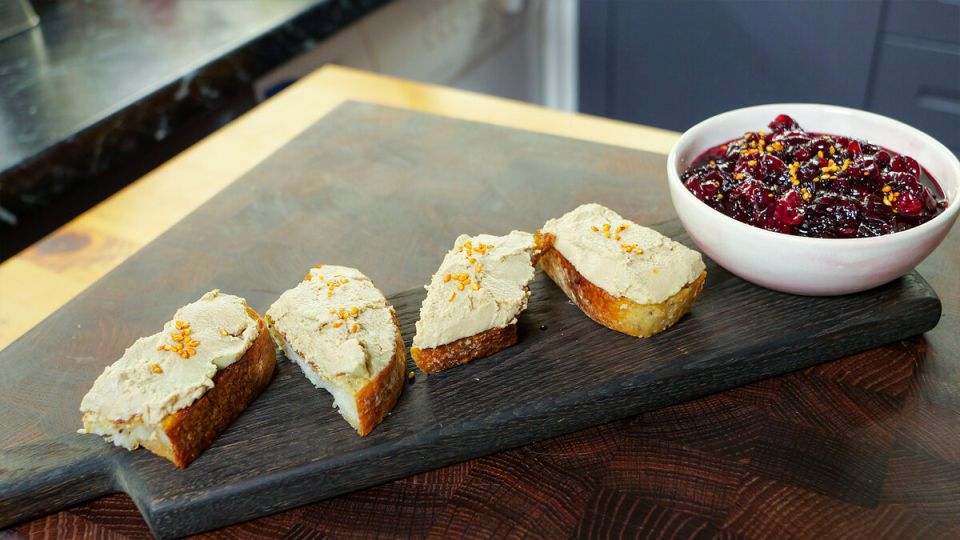 Тем временем обжарьте хлеб или багет на сливочном масле с обеих сторон. Намажьте на гренки любимый покупной паштет и подавайте вместе с вишневым джемом. Приятного аппетита!