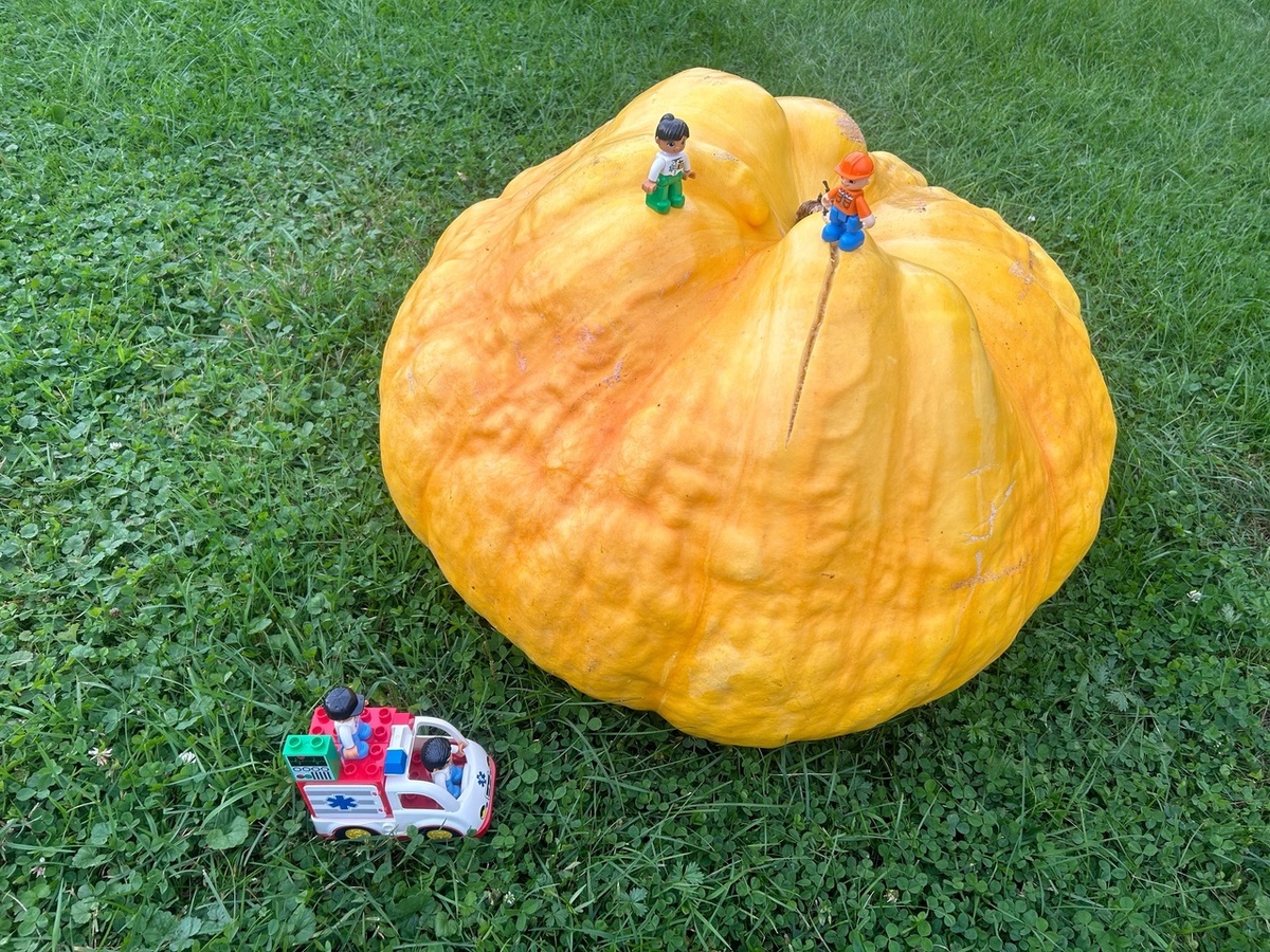 Планировалось изначально вырастить две тыквы на всякий случай. Однако одна из них, не выдержав испытаний, случайно упала и треснула.