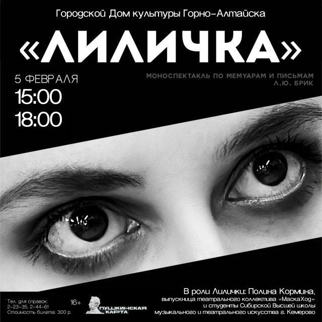 сегодня, 5 февраля, в 15:00 и в 18:00 камерный молодежный моноспектакль-концерт «Лиличка» по мотивам мемуаров и писем Лилии Брик.