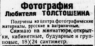 Толстошеин подошёл к делу серьёзно: выписал фотоматериалы из центра, освоил разные форматы съёмки и даже использовал русские и заграничные снимки для антуража. Однако, судя по тому, что после октября 1926 года его объявления в газете больше не появлялись, дело, видимо, не стало прибыльным.