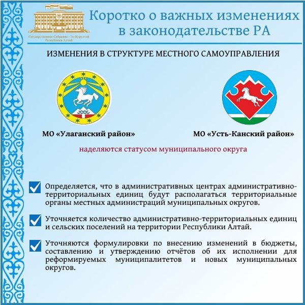 На данный момент свои полномочия сложил 71 совет депутатов сельских поселений из 91.Полностью на новую модель управления перешли Турочакский и Чойский районы. На очереди - Улаганский и Усть-Канский районы, где все сельские советы также сложили...