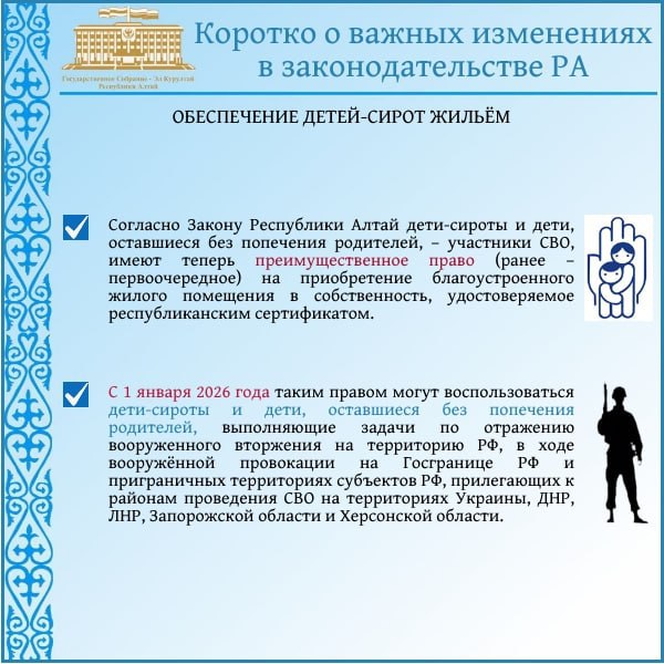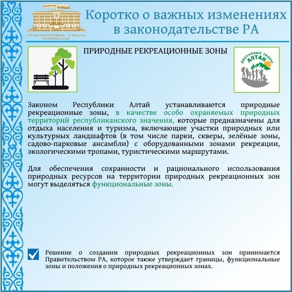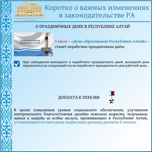 Подводя итоги, хочу отметить:Внесены изменения в закон о праздничных и памятных днях республики. День образования Республики Алтай – 3 июля – официально объявлен нерабочим праздничным днём.Принят закон, уточняющий, что преимущественным правом на...