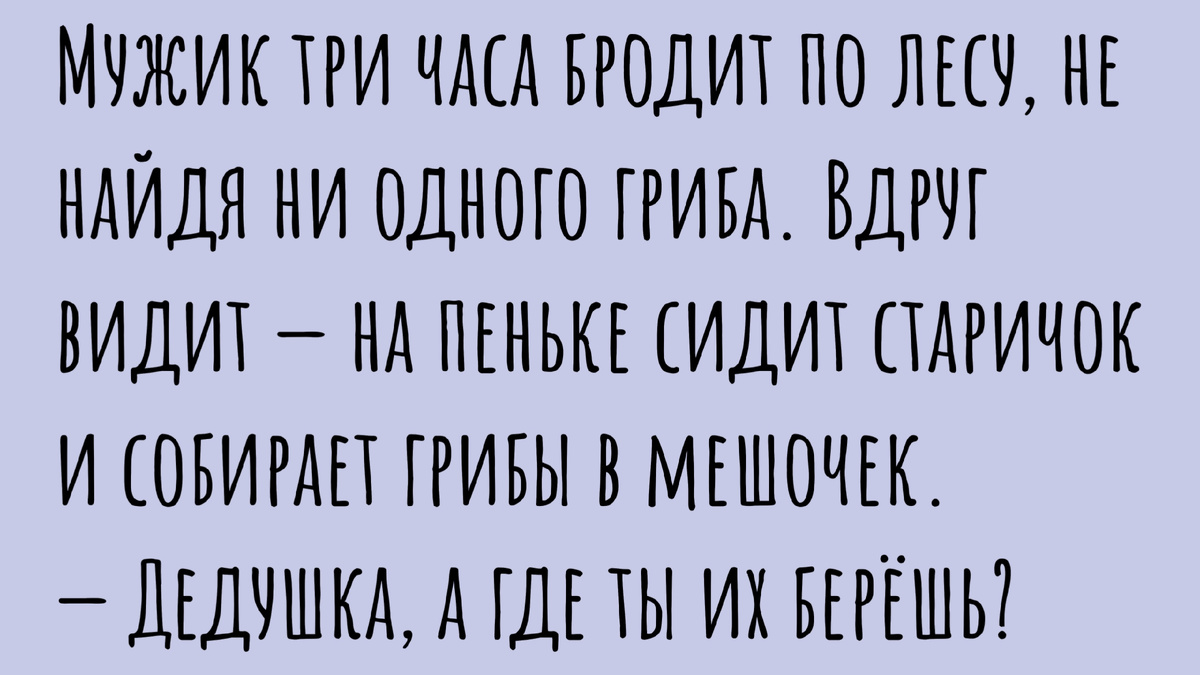 Грибы – это не только вкусный продукт, но и увлекательная страсть для многих. Совмещая походы в лес с «тихой охотой», любители природы находят радость в поисках грибов. В преддверии Всемирного дня грибника, который отмечается 3 октября, становится всё более актуальным внимание к народному юмору, отражающему любовь к этому занятию, пишет Papanya_1.