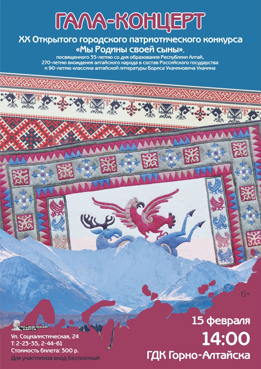 Жители и гости Горно-Алтайска! Приглашаем вас на Галла-концерт XX Открытого городского патриотического конкурса Мы Родины своей сыны, посвященного 35-летию со дня образования Республики Алтай, 270-летию вхождения алтайского народа в состав Российского государства и 90-летию классика алтайской литературы Бориса Укачиновича Укачина.
