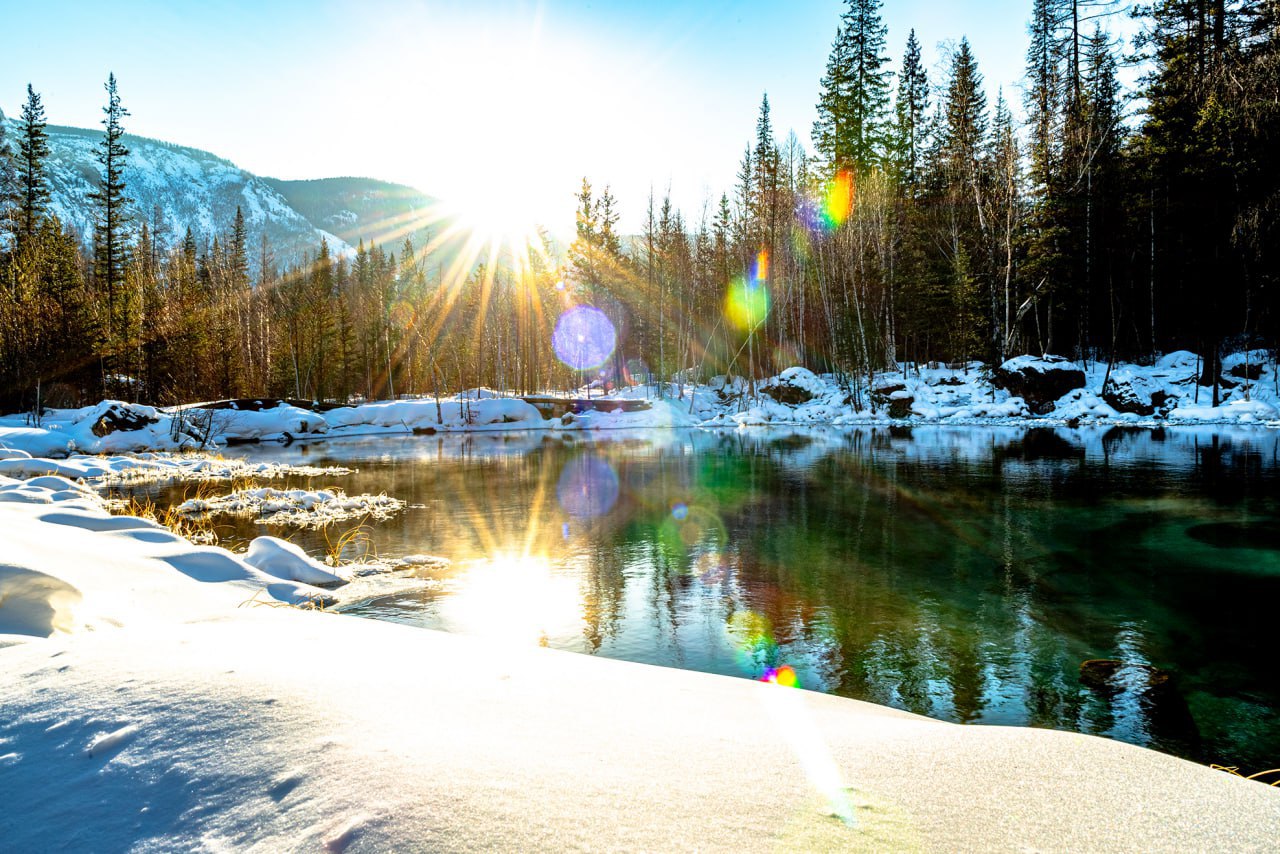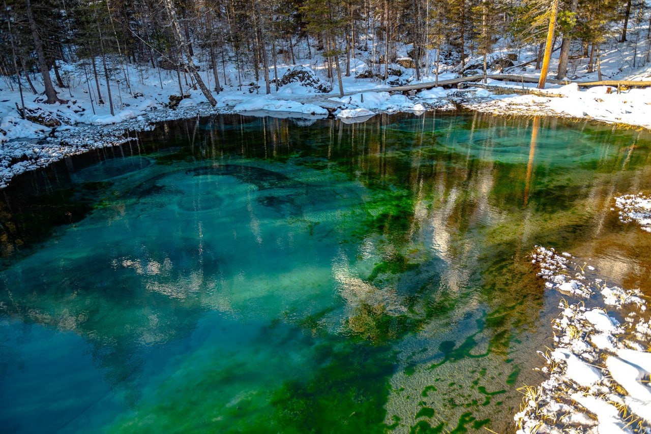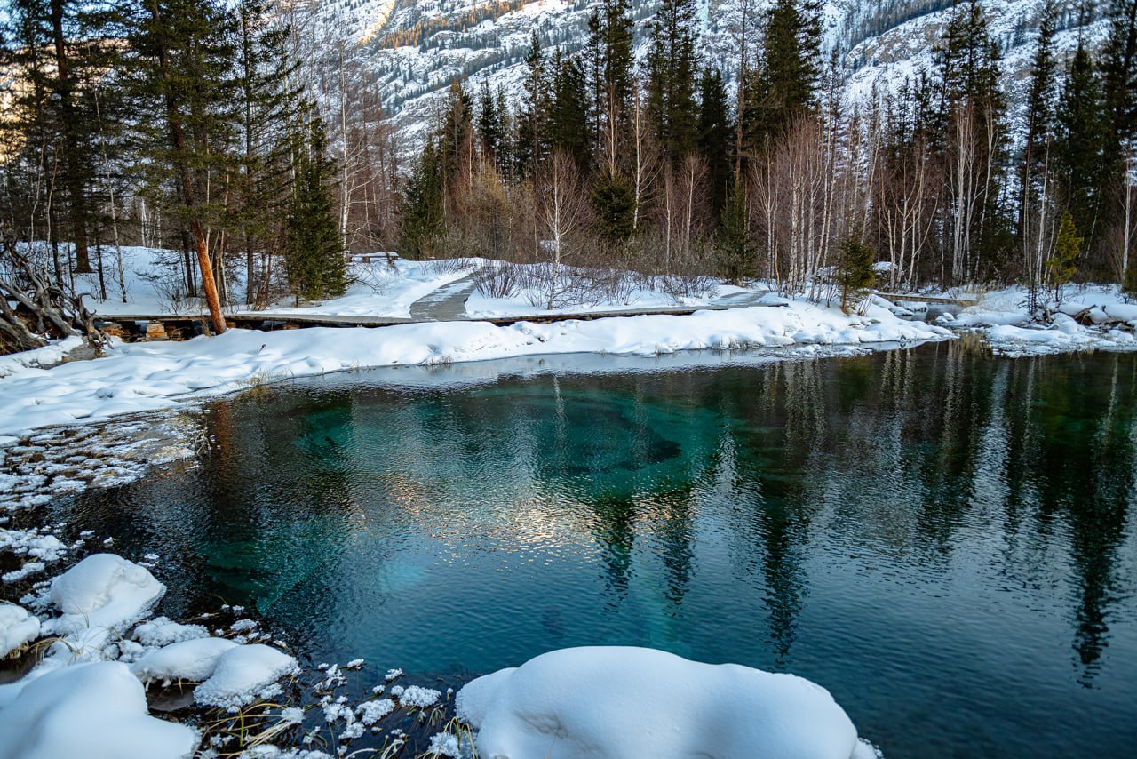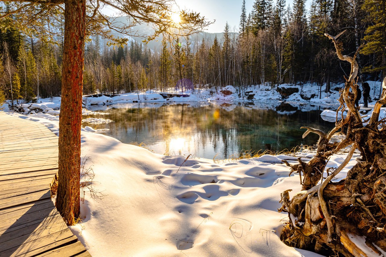Морозный воздух, тишина, нарушаемая лишь редким пением птиц, и первые лучи солнца, осторожно касающиеся заснеженного пейзажа. Именно так встречает путешественников Гейзерное озеро в Республике Алтай зимой на рассвете.
