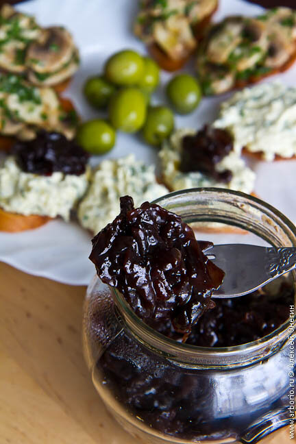 Первым делом следует подготовить лук: очистить и нарезать его толстыми полукольцами. Разогрев сковороду на среднем огне, добавить немного оливкового масла и обжаривать лук с щепоткой соли, чтобы он стал мягким и ароматным, но не подгорел. Постоянно помешивая, добиваться нужной консистенции. Затем ввести сахар и мед, залить вином, добавить оставшиеся специи и уксус. Тушить на небольшом огне до сгущения массы.
