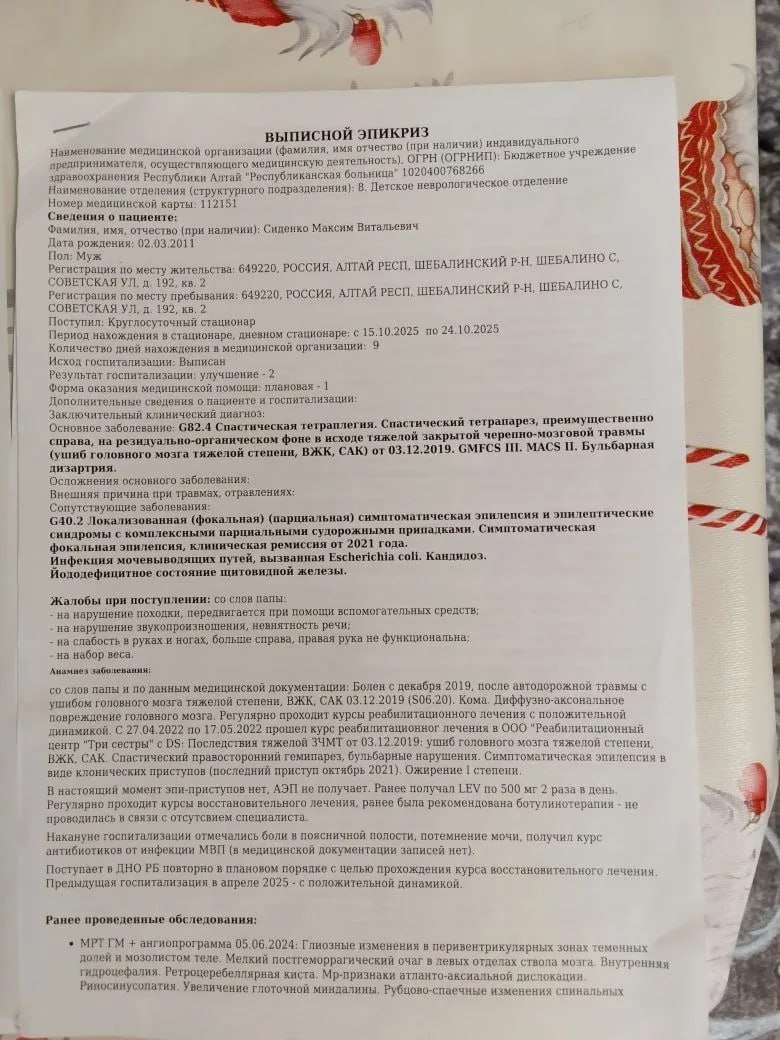 Я, Сиденко Юлия Александровна, мама Сиденко Максима Витальевича, прошу помощи в приобретении средств оснащения своему сыну, который пострадал в аварии в 2019 году.Максиму необходим вертикализатор «Глайдер» и аппарат механотерапии «Мотомед». Нам назначили ежедневные упражнения с ними в клинике «Три сестры» при прохождении реабилитации.