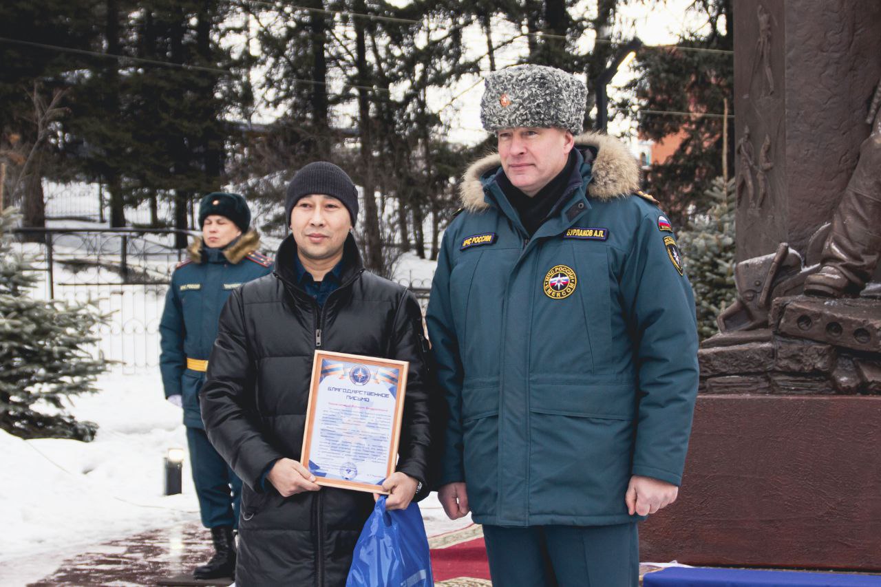 В Студенческом сквере состоялось торжественное открытие монумента в честь героев МЧС. Композиция скульптора Арчына Баданова изображает спасателя, держащего на руках ребенка.