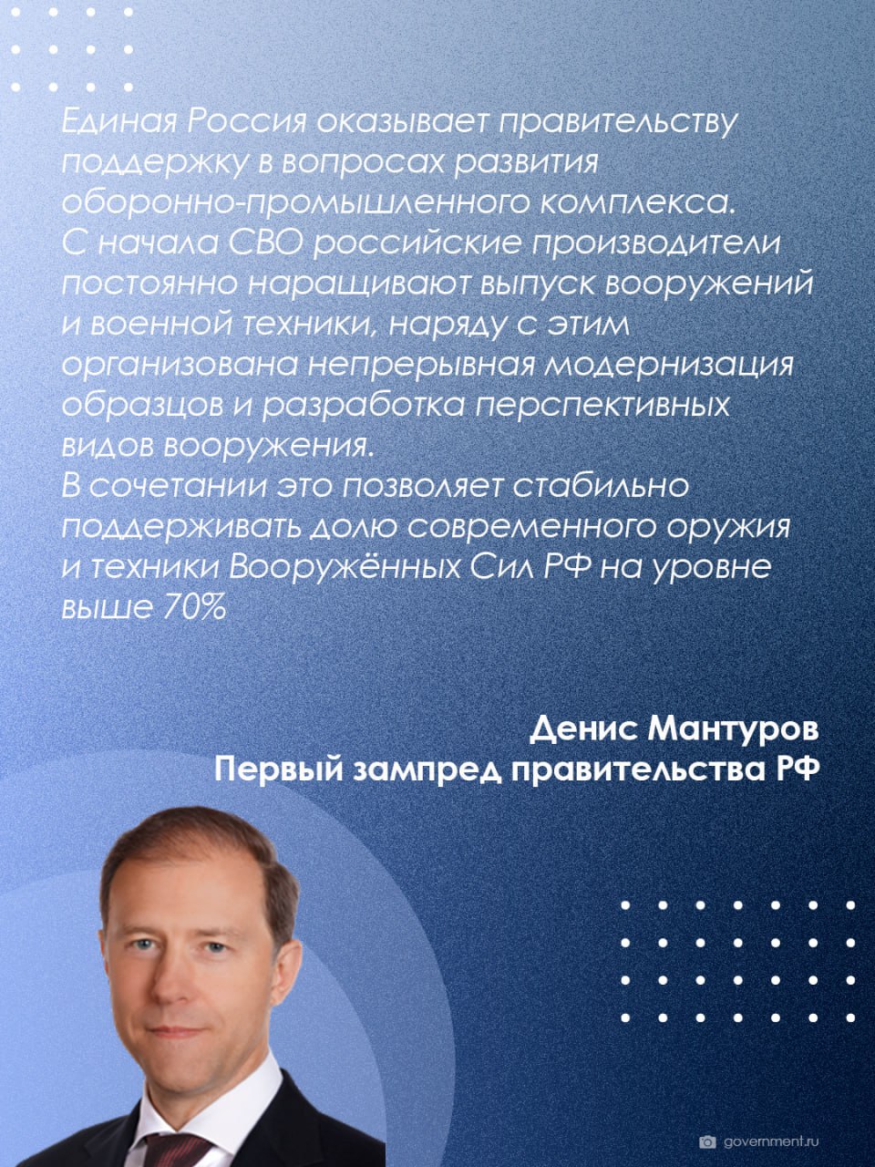 Первый зампред правительства Денис Мантуров отчитался о работе правительства по ряду положений народной программы Единой России. Ключевые точки сопряжения усилий правительства и Единой России обобщены в народной программе партии, подчеркнул он.