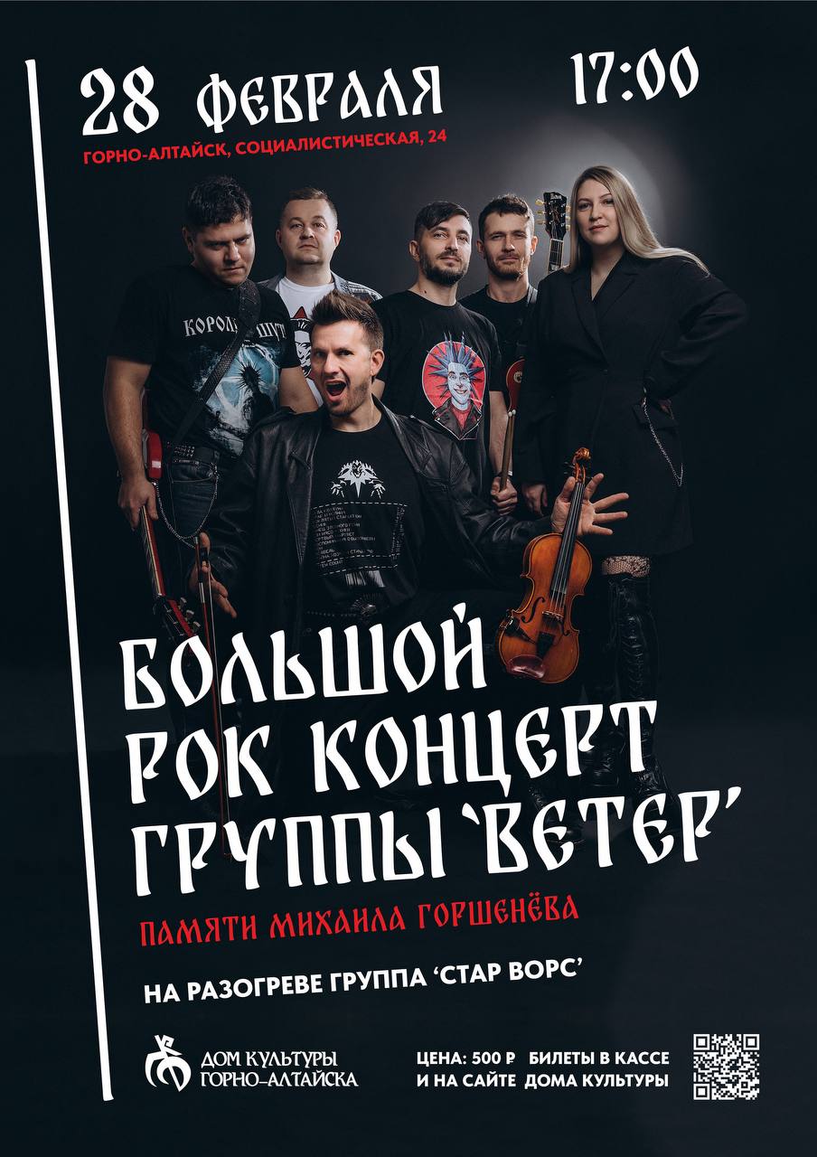 Группа «Ветер» основана в 2023 году. Этот концерт посвящён памяти Михаила Горшенёва, лидера группы «Король и шут». Песни, которые узнаваемы по первым аккордам, живой звук в сопровождении скрипки, акустической гитары, создадут неповторимую атмосферу.