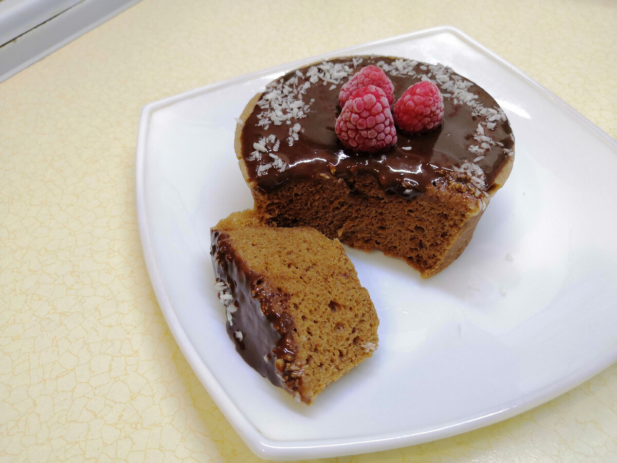 Для глазури растопите шоколад с молоком в микроволновке, следя за тем, чтобы шоколад не закипал. Добейтесь однородной консистенции и аккуратно нанесите глазурь на остывший кекс.