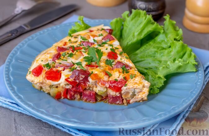 - Омлет с колбасой, овощами и сладким перцем — это не просто обычный омлет, а яркое и сочное блюдо, напоминающее запеканку. Большое количество овощей, вместе с привкусом полезной варено-копченой колбасы, делают его превосходным выбором для утреннего приёма пищи.