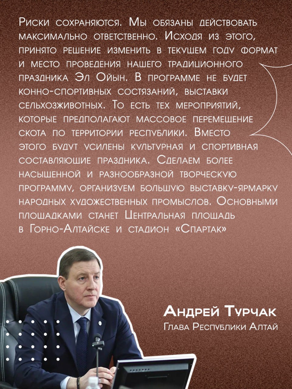 Глава республики отметил, что риски сохраняются, в связи с чем принято решение о переносе в Горно-Алтайск традиционного праздника алтайского народа «Эл Ойын» из-за сложной эпизоотической обстановки.