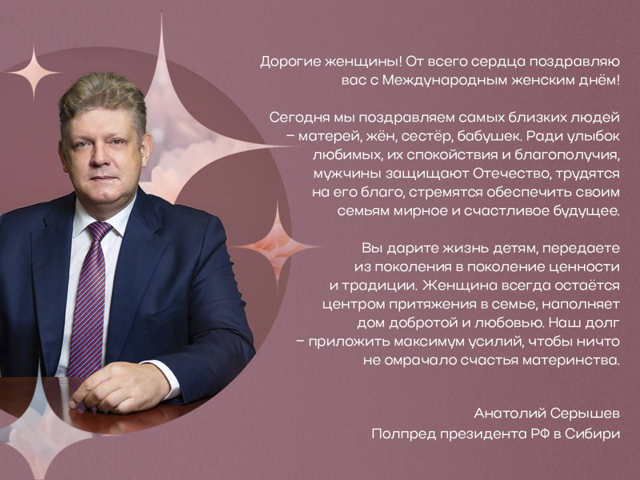 Полпред президента в Сибири Анатолий Серышев поздравил сибирячек с 8 Марта