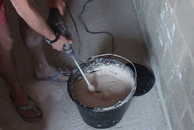 После грунтовки наступает время подготовить раствор. В специальную ёмкость следует добавить сухую смесь и воду. Далее, с помощью строительного миксера, массу перемешивают до однородной консистенции и оставляют на 10-20 минут. Только после этого можно приступать к нанесению на стены или потолок.