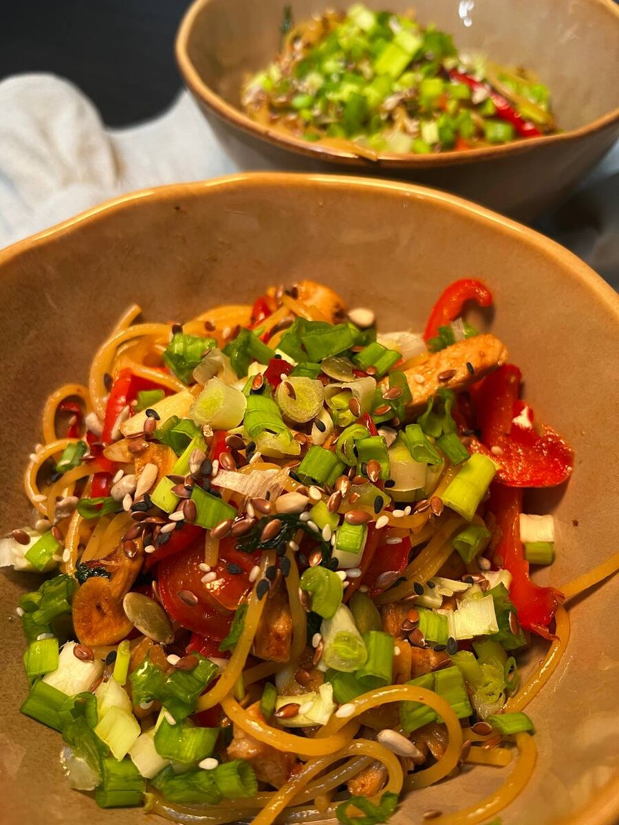 6. В конце добавить сладкий чили соус и еще раз перемешать, чтобы он равномерно распределился по блюду.