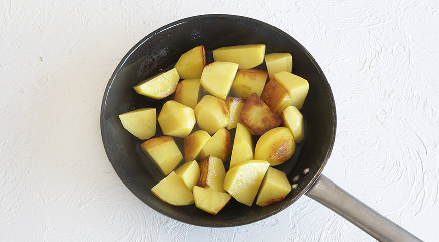 4. Картофель очистить и нарезать крупно. Обжарить на сковороде с растительным маслом до полуготовности, добавить к мясу и томить еще 20–30 минут до готовности. Подавайте рагу горячим, наслаждаясь уникальным вкусом!
