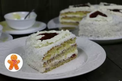 Тесто для формы 24 см складывается из простых компонентов: мука, сахар, яйца, сливочное масло, кокосовая стружка, ванильный сахар и разрыхлитель; щепотка соли добавляет баланс ароматов. Крем состоит из охлажденных сливок, сахарной пудры и ванили, соединённых с лёгким закрепителем или крахмалом. Для начинки и слоя — конфитюр, чтобы авторский вкус раскрылся по-настоящему.