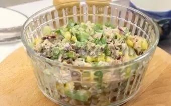 Теперь пришло время добавить консервированный тунец, который необходимо предварительно слить, и 3 столовые ложки кукурузы. С помощью соли и перца по вкусу приступить к заправке: 1 столовую ложку майонеза, 1 столовую ложку сметаны, 1 чайную ложку зерновой горчицы и немного меда. Все тщательно перемешать до однородной массы и подавать на стол.