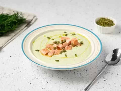 На сковороде обжарьте небольшими кубиками форель в оливковом масле до готовности, приправив солью и перцем. Разлейте охлажденный суп в тарелки, украшая обжаренной рыбой и посыпая сыром шнитт-лука и тыквенными семечками. Такой бесподобный суп заиграет новыми яркими вкусами и станет настоящим хитом вашего летнего стола!