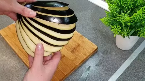 Для начала понадобиться один средний баклажан весом около 280 граммов. Его тщательно моют и нарезают на тонкие полоски, величиной примерно 0.5 сантиметра. Такой способ нарезки, напоминающий веер, позволяет сократить время приготовления и улучшить впитываемость добавленных ингредиентов.