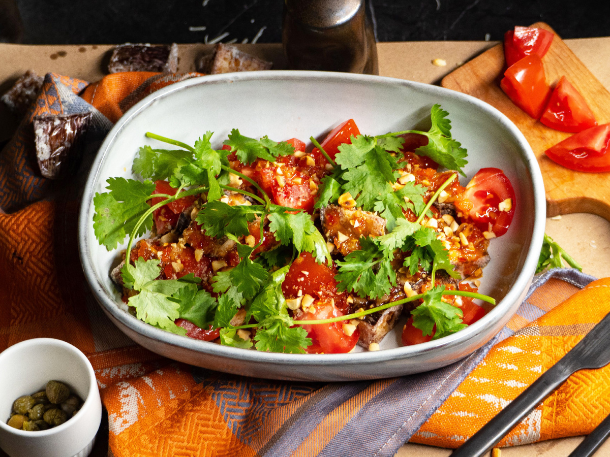 8. На окончательном этапе, на сервировочную тарелку положите смесь жареных баклажанов и нарезанных томатов, полейте соусом, посыпьте арахисом и украсьте свежей кинзой.