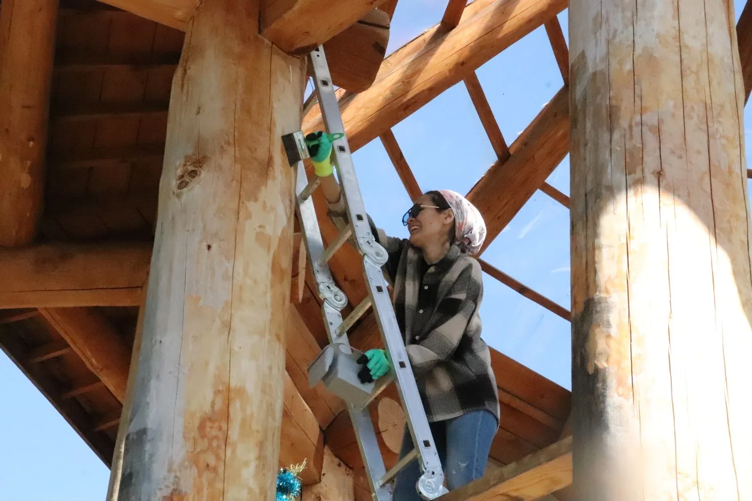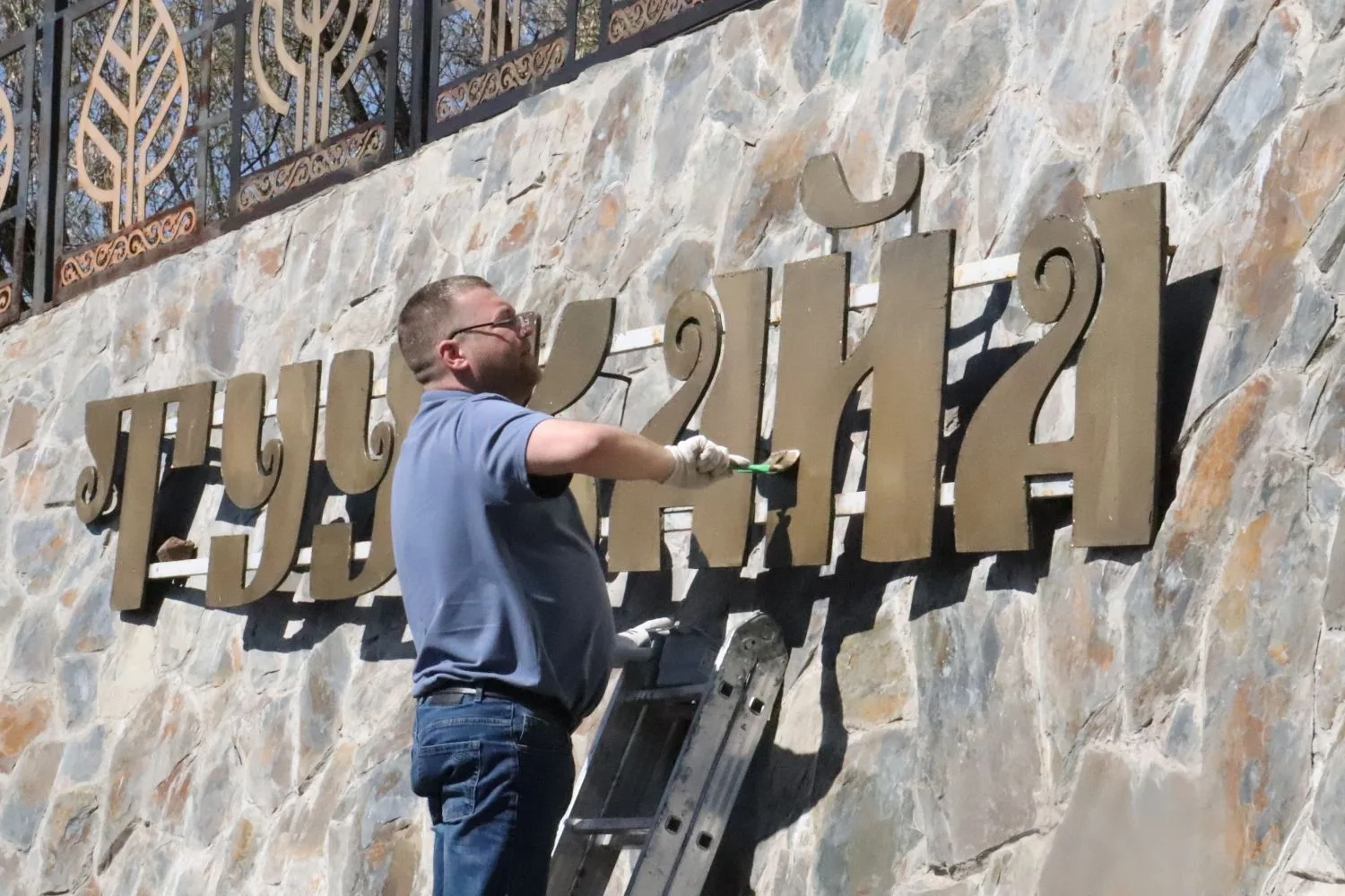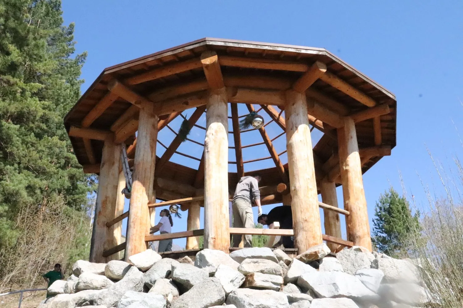 Строители очистили беседку зайсанов и лавочки, покрыли их маслом для дерева. Все вместе очистили тропу и площадку вокруг беседки.
