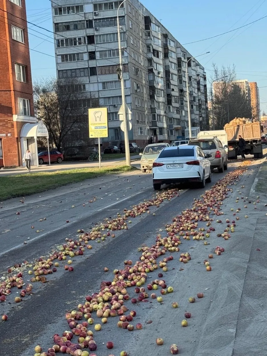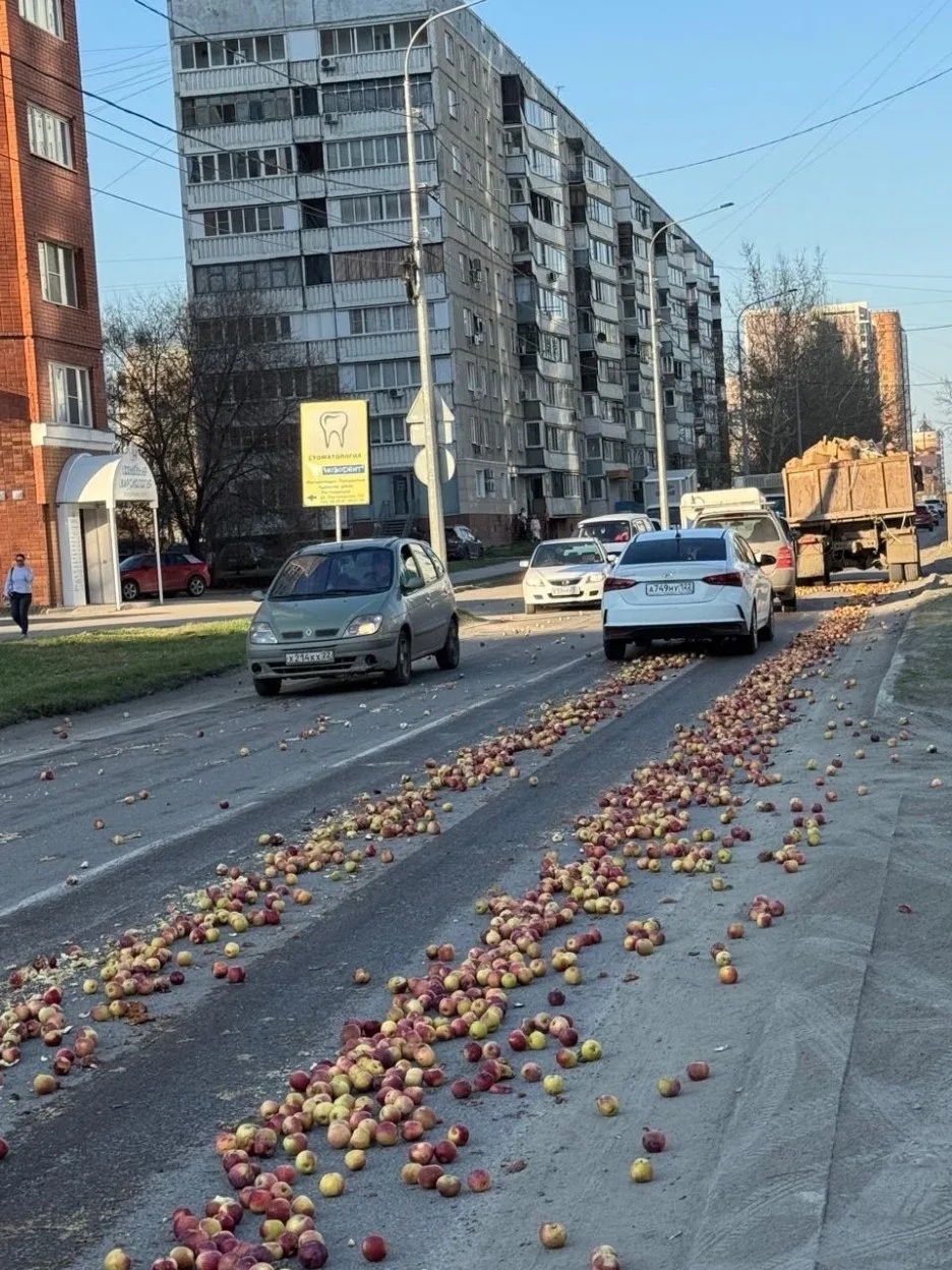 Фрукты выложили две ровные тропинки на проезжей части между переулком Радищева и улицей Циолковского. Яблоки не испорченные, а румяные и наливные — вероятно, они выпали из проезжавшего фургона.