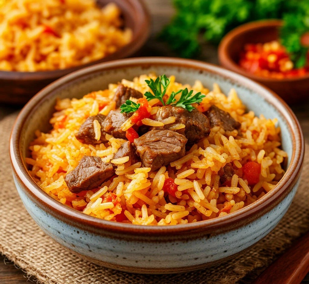 Сначала мясо нарезают на крупные куски и обжаривают с луком до золотистой корочки. Затем добавляют морковь, а после — специи и горячую воду, и все тушат под крышкой. В завершение укладывают промытый рис, заливают его водой и томят на медленном огне, что позволит раскрыть все ароматы.
